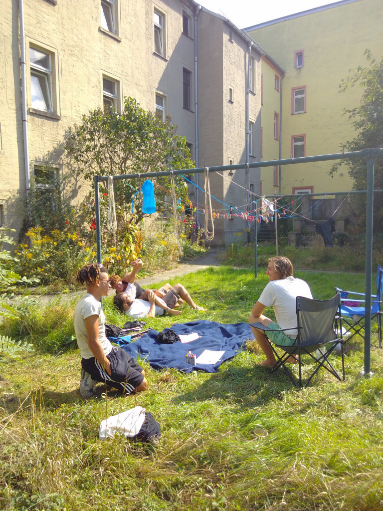 # [Kanthaus](https://kanthaus.online/) #### [Doug](https://dougwebb.site/), 2021-03-20  ##### (reading online? press 'p' for slide notes) ??? - This is my perspective - Obviously can't explain everything - Will go quickly, q's after ---  **Kanthaus:** Common house by/for techno-hippie-activist collective ??? - a pair of buildings & community of people - buildings owned and governed by community - for purposeful project work/ers - costs paid without rent - 'functional living' - ... --- # History _How did we get here?_ Kanthaus ← yunity ← **foodsharing** ---  > **Issue:** food (~1/3) is wasted ---  **Response:** [foodsharing](https://foodsharing.de/) - app-facilitated gifting of 'excess' food, 2012+ ---  **Outcome:** [46,000+ Tonnes of food](https://foodsharing.de/statistik) saved so far --- # History _How did we get here?_ Kanthaus ← **yunity** ← foodsharing ---  **Issue:** Foodsharing app only in German, has security issues, etc. ---  **Response:** Team (try) to recode platform, without money, 2015-2017 ??? very idealistic, very fun ---  **Outcome:** Social/infrastructure instability halt development --- # History _How did we get here?_ **Kanthaus** ← yunity ← foodsharing ---  **Issue:** It's hard to do anything useful without money _or_ infrastructure ??? - previous mill complex in Heichelheim - house in Darmstadt - previous care home in Rotterdam - previous kids clinic in Harzgerode - previous train station in Bad Dürrenberg - project house in Saasen ---  **Response:** Community buy house to run as for-purpose infrastructure --- # Location [Kantstraße 20 & 22, Wurzen 04808](https://www.openstreetmap.org/?mlat=51.36707&mlon=12.74076#map=19/51.36707/12.74076) (~30 km east of Leipzig) ---  **Kantstraße:** It's the two on the extreme left (no pun intended). ---  **Garden.** Buildings built 1880s, abandoned for ~10 years before us. ---  **Wurzen:** from high up, you don't smell the dog 💩 --- class: top, left ## Beginning steps - 2017: We plan the details at another community - 2017: We internally crowd-fund €50k from 7 members - 2017: HWR tell us about Kantstraße buildings - 2017: €45k paid to WGW for both houses - 2017-07-12: We get the keys - 2017-08-05: Constitution adopted, 4 initial members ---  --- class: top, left ## Beginning state - no - water - electricity - internet - gas - furniture - roof - leaking - community - small - unsure 🙃 ---  **Leaky roof:** Matthias patching it ---  **Indoor camping:** with salvaged festival stuff --- ## Now It has improved somewhat: https://kanthaus.gitlab.io/expfloorer/ --- class: top, left ## Functional living - 'normal' - each person gets one room - remaining rooms communal - 'functional' - community puts rooms to functions - [Blog article from Janina about functional living](https://kanthaus.online/en/blog/2020-03-24_functional-living) ---  **Communal sleeping room:** and occasional cinema ---  **Electro-workshop:** for working on sparky-things ---  **Related:** _default_-FKK bathroom (can be made private!) --- # People ---  **Population:** net number since the beginning ---  **The family:** A whole new generation --- ## Projects List on the [website](https://kanthaus.online/en) --- class: top, left # System - schedule - CoMe - documents - constitution - collective agreements - positions - visitor - volunteer - member - evaluation - decisions ---  **Week schedule:** CoMe, Power Hour(s) — weekly. --- ## CoMe > _"The **Co**ordination **Me**eting is the only weekly meeting everyone is recommended to join. This makes it the main 'real-life' event we have for sharing information and ideas. ..."_ — from [CoMe facilitation advice](https://gitlab.com/kanthaus/kanthaus-governance/-/blob/master/documents/coordinationMeeting/coMeFacilitationAdvice.md) --- class: top, left ## [Constitution](https://kanthaus.online/en/governance/constitution) - describes kanthaus _system_ - purposes - decision-making - conflict resolution... - difficult to change, only members can vote ---  **'[Governing the Commons](https://www.actu-environnement.com/media/pdf/ostrom_1990.pdf)':** Influential in writing documents. --- class: top, left ## [Collective agreements](https://kanthaus.online/en/governance/collectiveagreements) - collects _rules_ - i.e. things there would be consequences for if someone did them - animals - smoking... - easier to change, members and volunteers can vote --- class: top, left # Positions - Visitor - 'newbies' - check-in round after first week - evaluation after 3 weeks - Volunteer - can vote on collective agreements - evaluation after 2 months - Member - 'core contributors' - can vote on constitution - evaluation after 6 months --- class: top, left # Evaluation - periodic 'appraisal' for all Kanthäusler - like a 'sharing circle' focussed on one person - ask deeper questions & bring up pain-points - person then leaves - 'mock vote' - discussion - final vote --- # Other ---  **Gleaning/Nachernten:** fun food-saving with edible reward ---  **The Vortex:** Items progressively leaving the house, inspired by hacklabs ---  **Schleckregal:** Is it clean enough for you to use without washing? ---  **Watery toilets:** cleaner, faster... ---  **Drying clothes:** no toilet-paper required (90 C washing) ---  **Wash kitchen:** to make clothes and food clean --- class: top, left ## Unanswered questions - Kids? - Purpose? - Entrenched hierarchies? - Population limit? - Effectiveness? - Security with age? - De-marketization security? - Functional living vs. preferences?